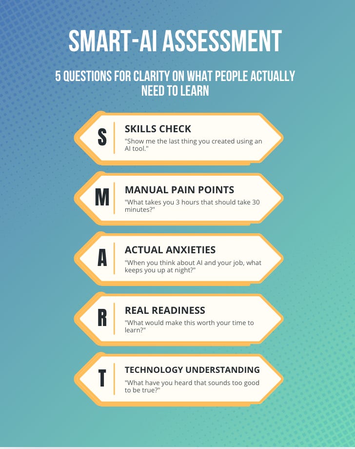 This week, pick three people representing different attitudes toward AI. Spend 15 minutes with each using the SMART questions. You should start seeing patterns that other assessments miss.