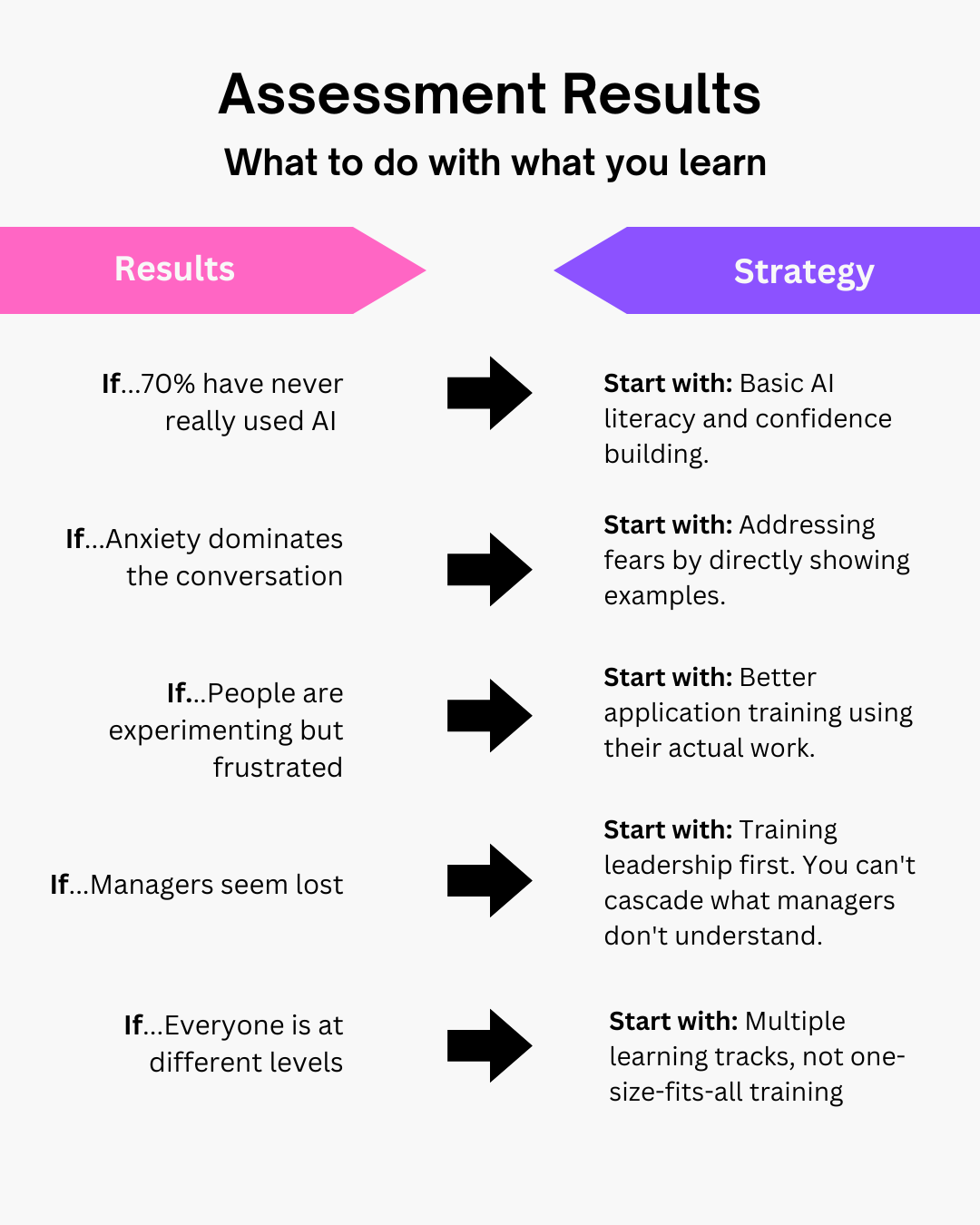 You’ll hear fears about job displacement, feeling left behind, confusion, or skepticism. Training needs to match these anxieties: scared people need reassurance and augmentation examples; skeptics want proof and results; confused folks need step-by-step basics. One-size-fits-all “AI training” doesn’t cut it.